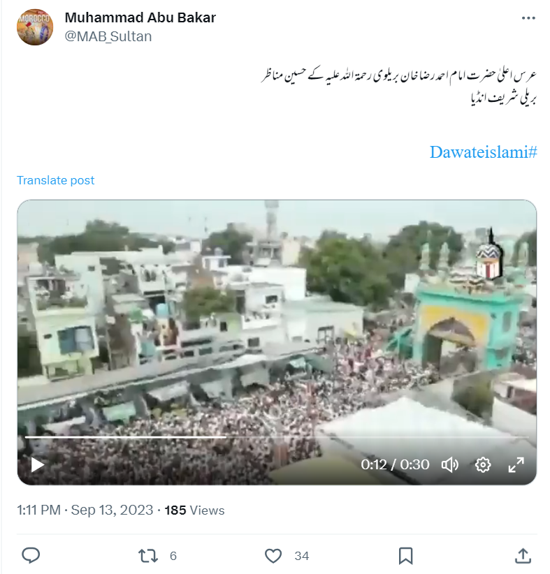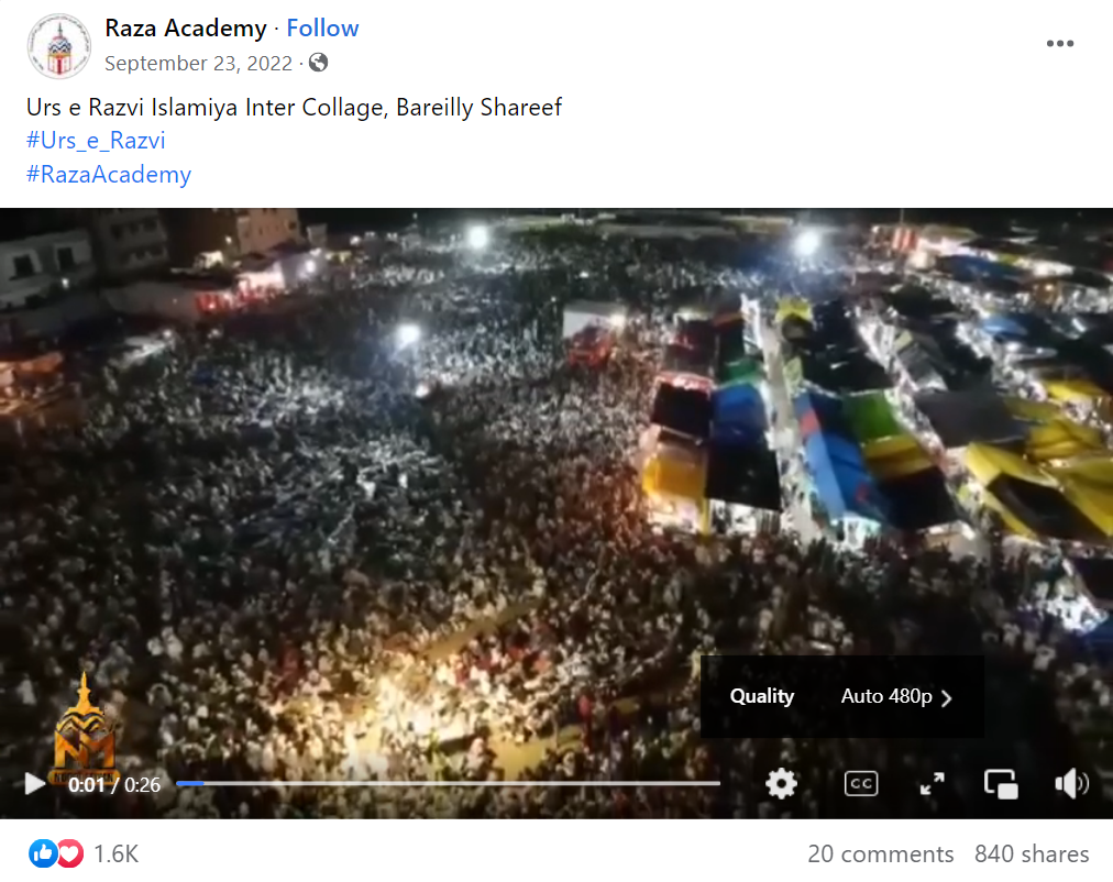 اترپردیش کے بریلی میں تین روزہ 105واں عرس اعلیٰ حضرت امام احمد رضا خان حنفی قادری کا اختتام 13 سمتبر 2023 کو پائے تکمیل تک پہنچ گیا۔ اب سوشل نٹورکنگ سائٹس فیس بک اور ایکس (ٹویٹر)پر فضا سے فلمائی گئی ایک ویڈیو شیئر کی جا رہی ہے۔ جس میں عوام کا جم غفیر اور خیمے نظر آ رہے ہیں۔ دعویٰ کیا جا رہا ہے کہ ویڈیو اترپردیش کے بریلی میں ہونے والے عرس 2023 اعلیٰ حضرت کی ہے۔ بتادوں کہ عرس رضوی ہر سال بریلی کے اعلیٰ حضرت درگاہ میں منایا جاتا ہے۔ جس میں ہزاروں کی تعداد میں عقیدت مند شرکت کرتے ہیں۔