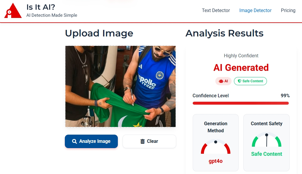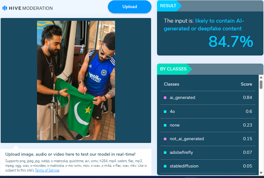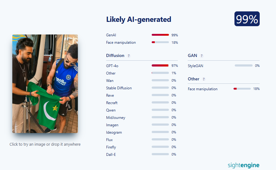 مزید تصدیق کےلئے ہم نے اے آئی ڈیٹیکشن ٹولز کے ذریعے تصویر کی جانچ کی، جس کے لئے ہائیو ماڈریشن، سائٹ انجن،از اٹ اے آئی ٹولز کی مدد لی، اس دوران واضح ہوا کہ تصویر مصنوعی ذہانت (اے آئی) کے ذریعے تیار کی گئی ہے۔ ہائیو ماڈریشن نے اپنے تجزیہ میں اس تصویر میں 84.7 فیصد، سائٹ انجن نے 99 فیصد اور از اٹ اے آئی نے بھی 99 فیصد اے آئی یا ڈیپ فیک سے تیار کردہ مواد ہونے کے امکانات ظاہر کئے ہیں۔