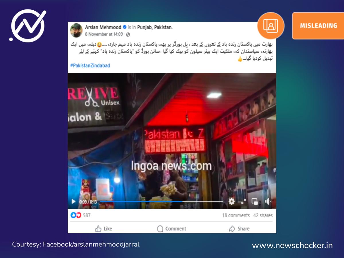 سوشل میڈیا پر وائرل ایک ویڈیو میں دعویٰ کیا جا رہا ہے کہ دہلی کے ایک ہیئر سیلون کے سائن بورڈ پر پاکستانی ہیکرز نے ’’پاکستان زندہ باد‘‘ لکھا، لیکن جانچ میں یہ دعویٰ غلط ثابت ہوا۔ ویڈیو دہلی کی نہیں بلکہ گوا کے باگا علاقے کی ہے، جہاں پولس نے اس معاملے میں دکان کے دو ملازمین کو گرفتار کیا ہے۔ مکمل فیکٹ چیک یہاں پڑھیں۔