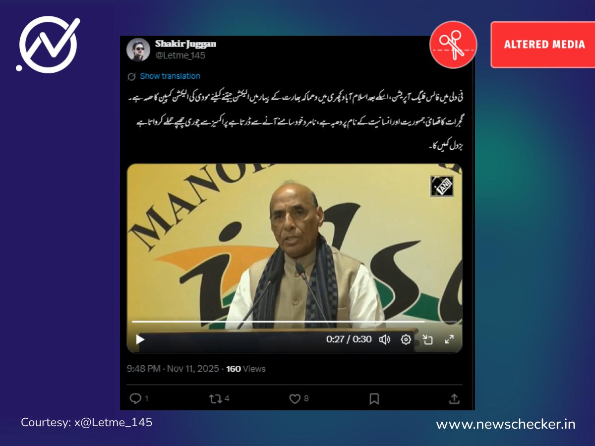 سوشل میڈیا پر ایک ویڈیو کے ساتھ دعویٰ کیا گیا کہ بھارتی وزیرِ دفاع راج ناتھ سنگھ نے دہلی دھماکے کو بہار الیکشن جیتنے کے لئے وزیراعظم مودی کی انتخابی حکمتِ عملی کا حصہ قرار دیا ہے، لیکن جانچ میں یہ ویڈیو ڈیپ فیک ثابت ہوئی ہے اور اصل میں راج ناتھ سنگھ نے ایسا کوئی بیان نہیں دیا۔ مکمل فیکٹ چیک یہاں پڑھیں۔