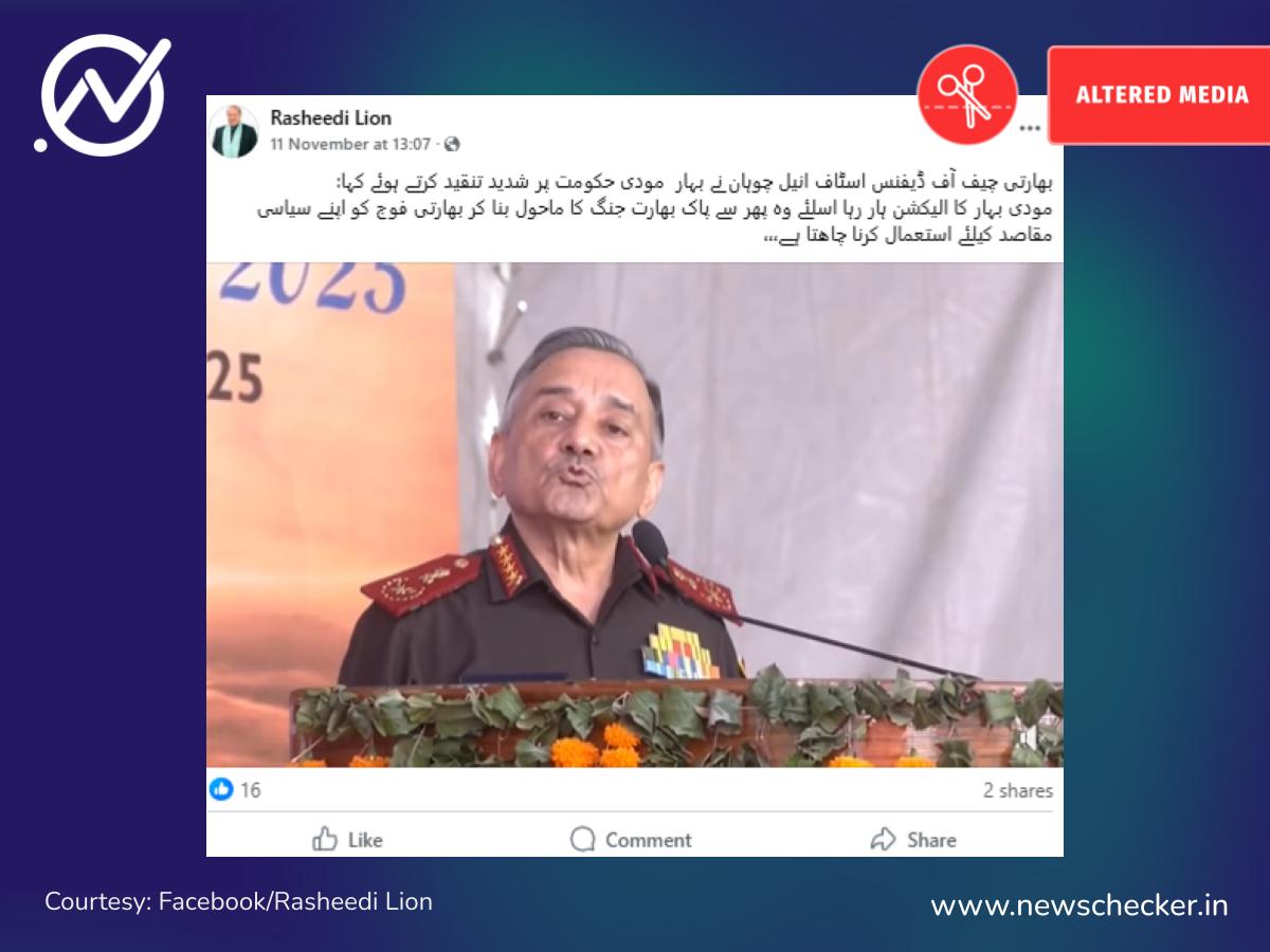 وائرل ویڈیو میں دعوی کیا گیا کہ جنرل انیل چوہان نے یہ کہا ہے کہ نریندر مودی حکومت بہار کا الیکشن ہار رہی ہے، اس لئے وہ پاک بھارت جنگ کا ماحول بنا کر فوج کو سیاسی مقاصد کے لئے استعمال کرنا چاہتی ہے، لیکن تحقیق واضح کرتی ہے کہ ویڈیو جعلی (ڈیپ فیک) ہے، اصل ریکارڈنگ میں جنرل چوہان نے نہ الیکشن کا ذکر کیا اور نہ مودی حکومت پر تنقید کی۔ مکمل فیکٹ چیک یہاں پڑھیں۔