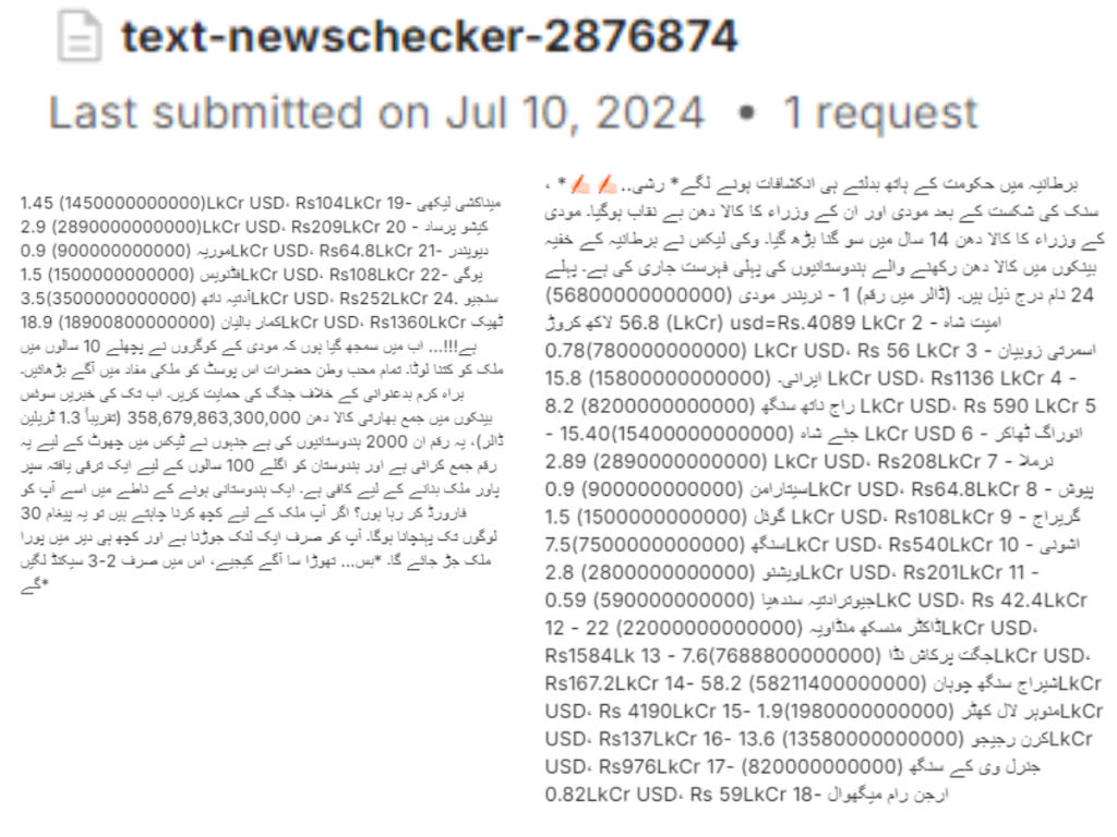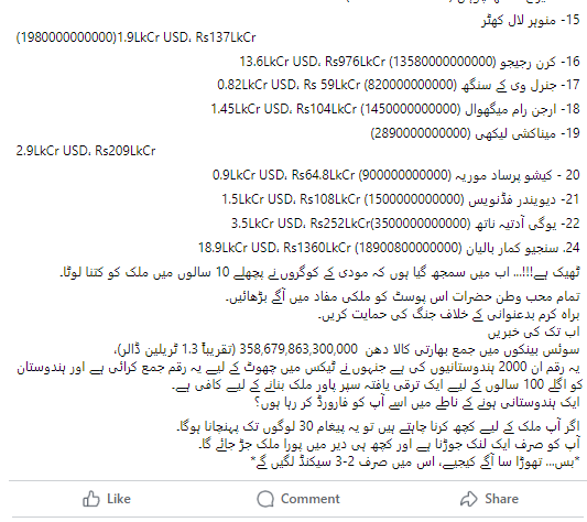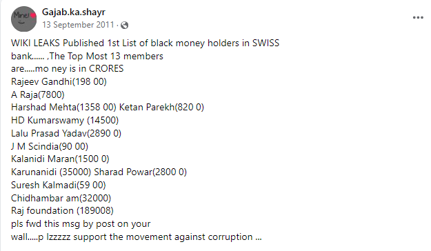 اس لسٹ کو شیئر کرتے ہوئے کیپشن میں لکھا ہے “برطانیہ میں حکومت بدلتے ہی انکشافات ہونے لگے ہیں۔ ریشی سوناک کی شکست کے بعد مودی اور ان کے وزراء کا کالا دھن بے نقاب ہوگیا۔ مودی کے وزراء کا کالا دھن 14 سال میں سو گنا بڑھ گیا۔ وکی لیکس نے برطانیہ کے خفیہ بینکوں میں کالا دھن رکھنے والے ہندوستانیوں کی پہلی فہرست جاری کی ہے”۔