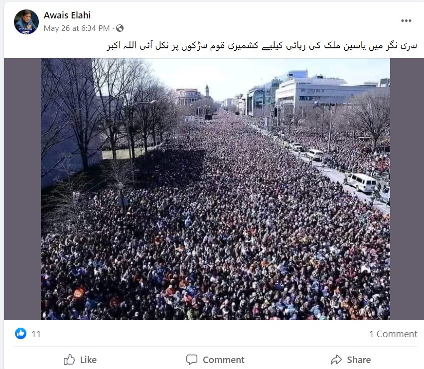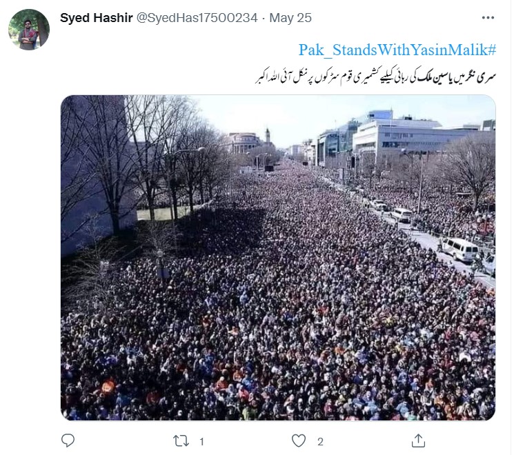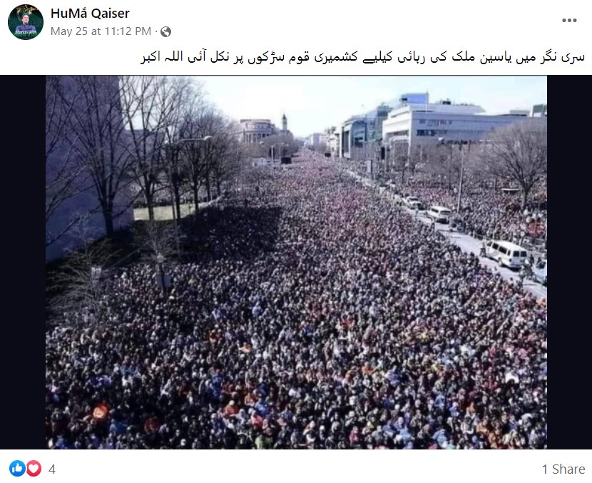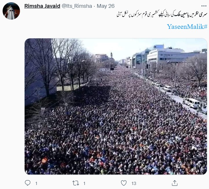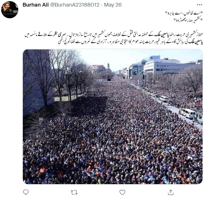 سوشل میڈیا پر سڑکوں پر بھیڑ کی ایک تصویر کو سرینگر میں یاسین ملک کی سزا کے خلاف مظاہرے کا بتا کر شیئر کیا جا رہا ہے۔ ٹویٹر پر ایک صارف نے تصویر کے کیپشن میں لکھا ہے کہ “ملک یاسین کی سزا کے خلاف سرینگر میں احتجاج، یہ آزادی کی جنگ جو کشمیری لڑ رہے ہیں”۔