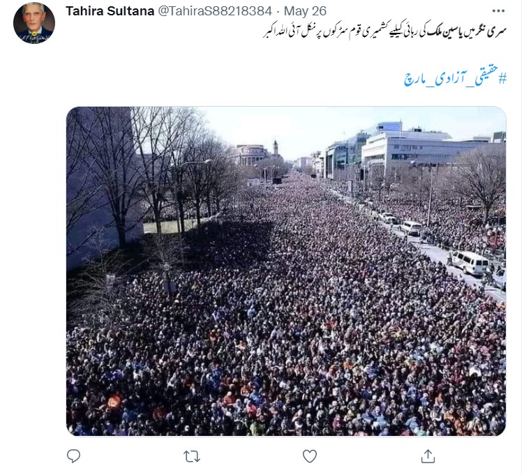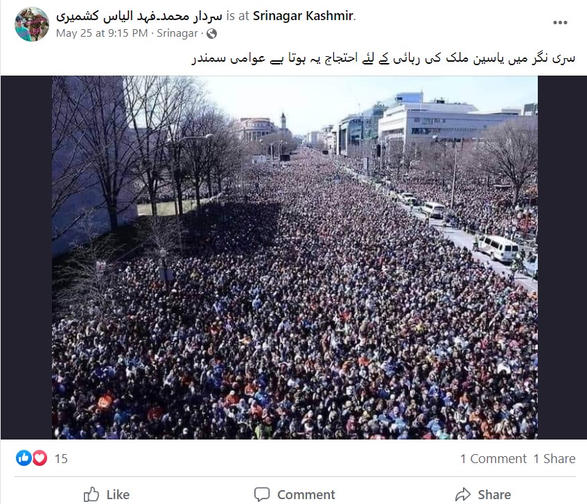 نیوز چیکر کی تحقیقات میں یہ ثابت ہوا کہ جس تصویر کو سرینگر میں یاسین ملک کی سزا کے خلاف مظاہرے کا بتاکر شیئر کیا جا رہا ہے، وہ دراصل 2018 کی ہے اور واشنگٹن ڈی سی میں ہوئے “آور لیوز ریلی” میں شریک ہوئے لوگوں کی ہے۔
