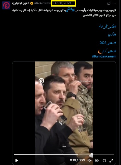 سوشل میڈیا پر یوکرینی صدر ولودومیر زیلنسکی کی ایک ویڈیو شیئر کی جا رہی ہے۔ جس میں وہ فوجی جوانوں کے کھانے کے میز پر نظر آرہے ہیں اور اذان کی آواز بھی سنائی دے رہی ہے۔ ویڈیو کے ساتھ فیس بک صارف نے کیپشن میں لکھا ہے “یوکرین کے صدر زیلنسکی رمضان المبارک میں یوکرین کے مسلم فوجیوں کے ساتھ افطار میں شریک ہیں #یوکرین #رمضان“۔