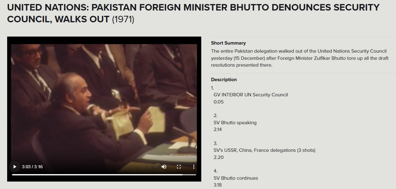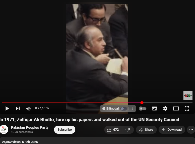 جواب: وائرل ویڈیو دراصل بھٹو کی تاریخی تقریر کی کلپ ہے جو انہوں نے اقوامِ متحدہ کی سلامتی کونسل میں 1971 کے دوران دی تھی۔