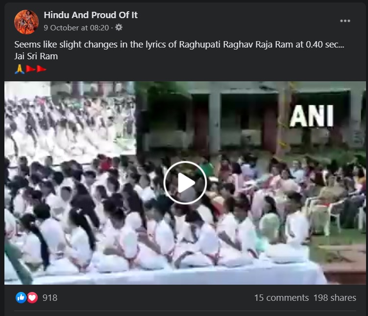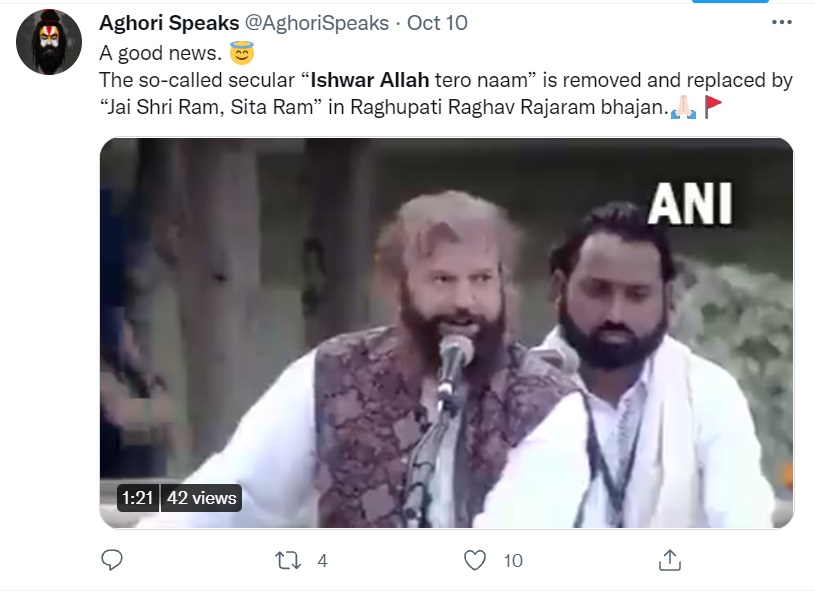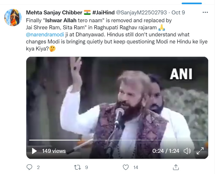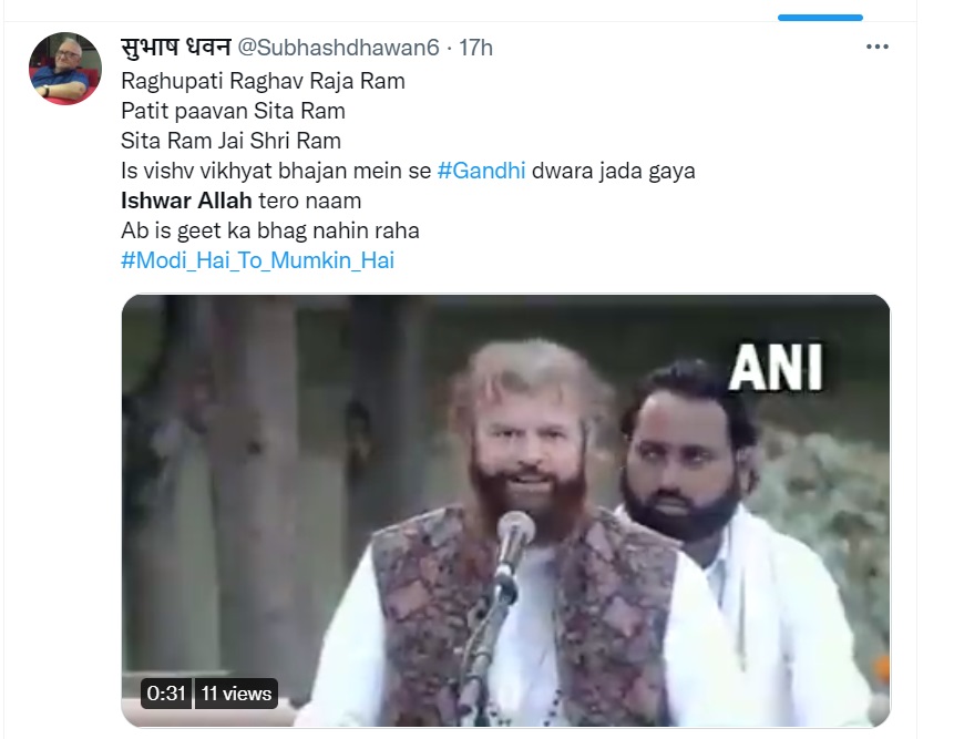 ان دنوں سوشل میڈیا پر ایک ویڈیو وائرل ہو رہا ہے، جس میں بی جے پی ممبر پارلیمنٹ اور ممتاز گلوکار ہنس راج ہنس رگھوپتی راگھو راجا رام بھجن گاتے ہوئے نظر آ رہے ہیں۔ اس ویڈیو کے ساتھ صارفین کیپشن میں لکھ رہے ہیں کہ “آخرکار رگھوپتی راگھو راجا رام سے ایشور اللہ تیرو نام ہٹا دیا گیا ہے اور اس کی جگہ جے شری رام، سیتا رام گایا جا رہا ہے”۔