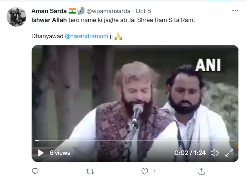 اس ویڈیو میں مع وزیر اعظم نریندر مودی اور نائب صدر وینکیا نائیڈو کے حاضرین میں کئی معروف شخصیتوں کی موجودگی دیکھی جا سکتی ہے۔ اس ویڈیو میں گلوکار بھجن میں ایشور اللہ تیرو نام کے بجائے چار مرتبہ جے شری رام، سیتا رام دوہراتے ہوئے نظر آ رہے ہیں۔ یہ ویڈیو ٹویٹر پر “@شیتل پرونامو” نے شیئر کیا ہے اور ہمارے آرٹیکل لکھنے تک اس پوسٹ کو 9000 سے زیادہ لائکس اور 2700 سے زائد ری ٹویٹ کیا جا چکا تھا۔