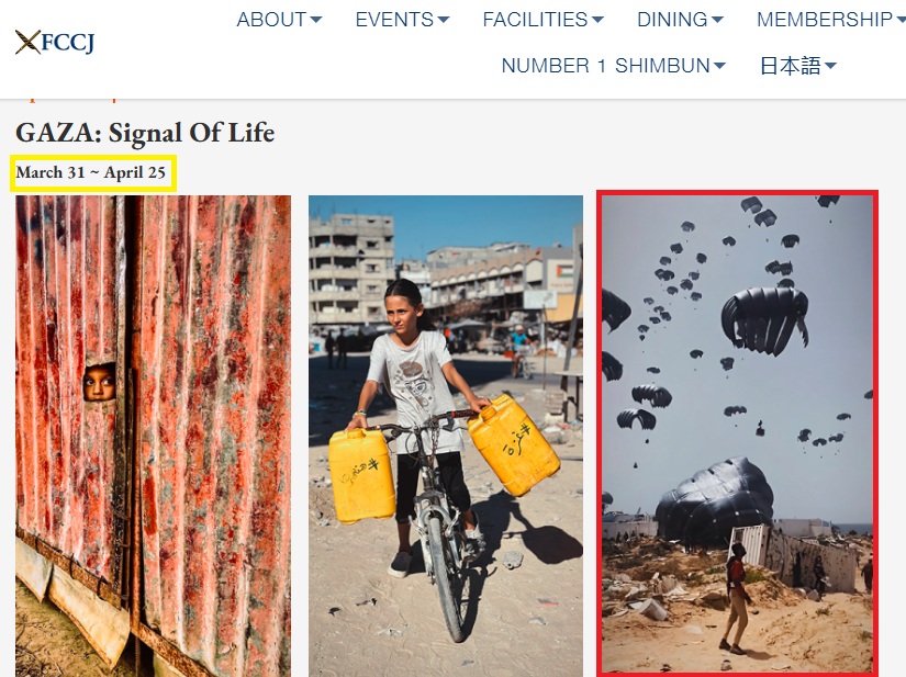 سعودی کی جانب سے حالیہ دنوں غزہ کو بھیجی گئی مدد کا بتاکر شیئر کی گئی ویڈیو کی حقیقت جاننے کے لئے ہم نے سب سے پہلے ویڈیو کے ایک فریم کو گوگل لینس کی مدد سے تلاش کیا۔ اس دوران ہمیں دی فورین کاریسپونڈینٹ کلب آف جاپان کی ویب سائٹ پر فلسطینی فلمساز اور فوٹوگرافر عامر ناصر کی تصاویر کی نمائش ملی۔ ان تصاویر میں ایک تصویر وائرل ویڈیو سے ملتی جلتی تھی۔