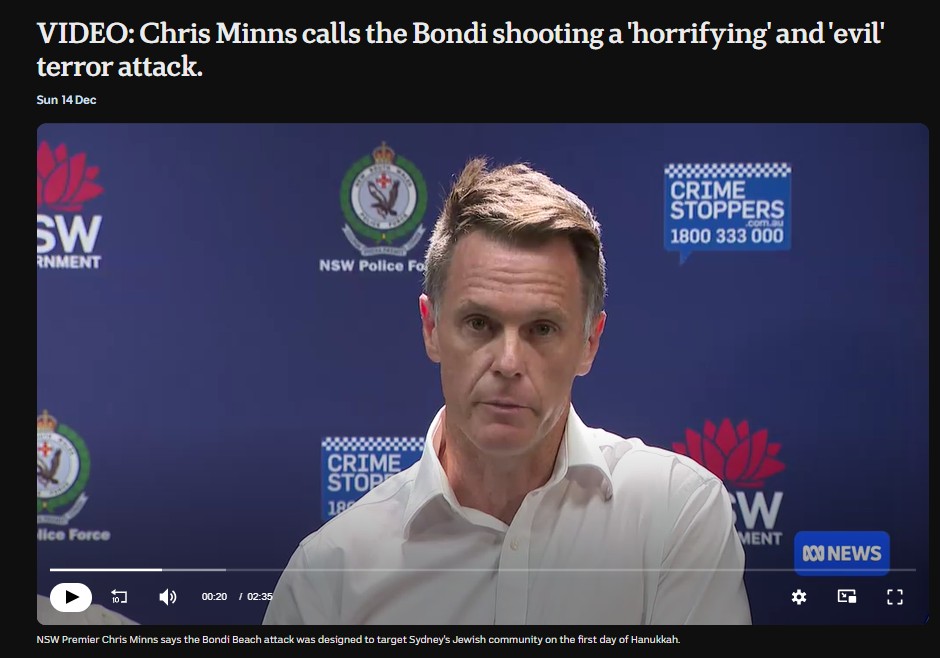 A reverse image search of the keyframes led to a video report published by ABC News, whose logo is seen in the viral clip- on December 14, 2025, stating “NSW Premier Chris Minns says the Bondi Beach attack was designed to target Sydney’s Jewish community on the first day of Hanukkah.”
