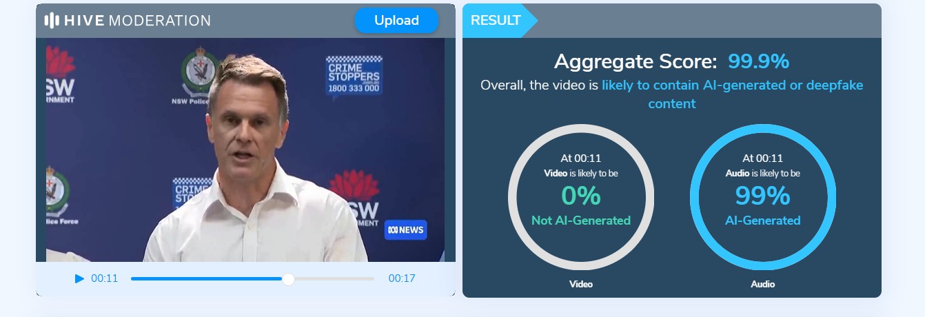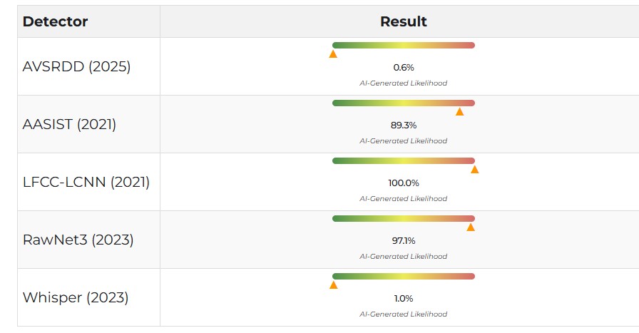 - 3 out of 5 detectors of Deepfake-o-meter concluded a high probability of audio being AI generated.