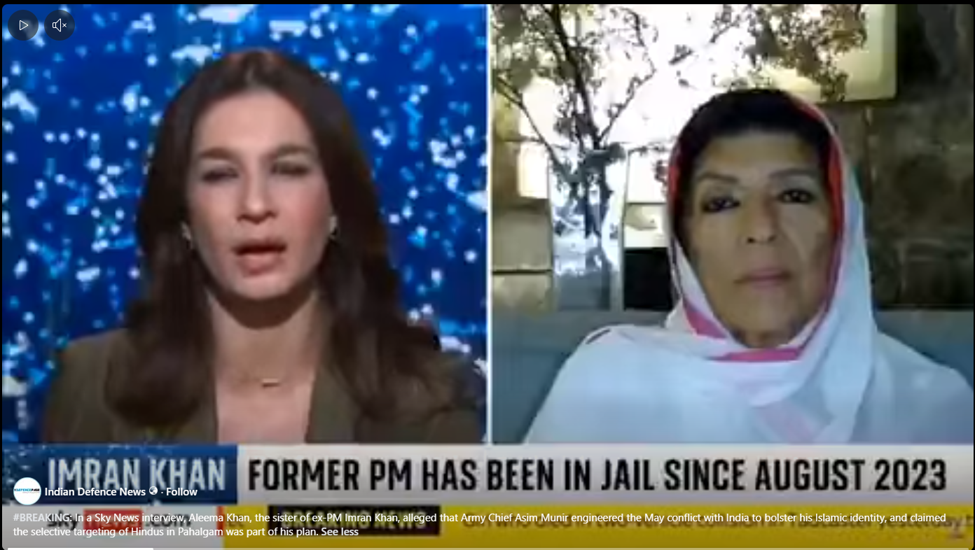 The video has been shared on Facebook with the caption, “#BREAKING: In a Sky News interview, Aleema Khanum, the sister of ex-PM Imran Khan, alleged that Army chief Asim Munir engineered the May conflict with India to bolster his Islamic identity, and claimed the selective targeting of Hindus in Pahalgam was part of his plan”. (Archive Link)