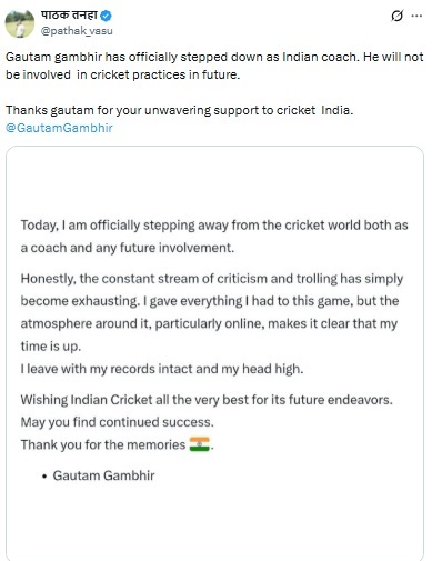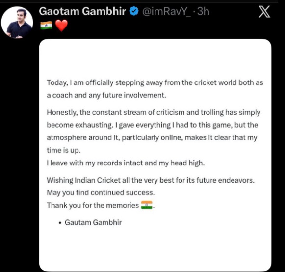“Today, I am officially stepping away from the cricket world both as a coach and any future involvement. Honestly, the constant stream of criticism and trolling has simply become exhausting. I gave everything I had to this game, but the atmosphere around it, particularly online, makes it clear that my time is up. I leave with my records intact and my head high. Wishing Indian Cricket all the very best for its future endeavours. May you find continued success. Thank you for the memories, Gautam Gambhir,” reads the purported announcement.