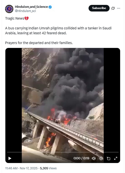 The viral video does not show the recent Saudi Arabia bus crash involving Umrah pilgrims. It is old footage from a 2017 fuel tanker accident in Abha and is unrelated to the current tragedy.