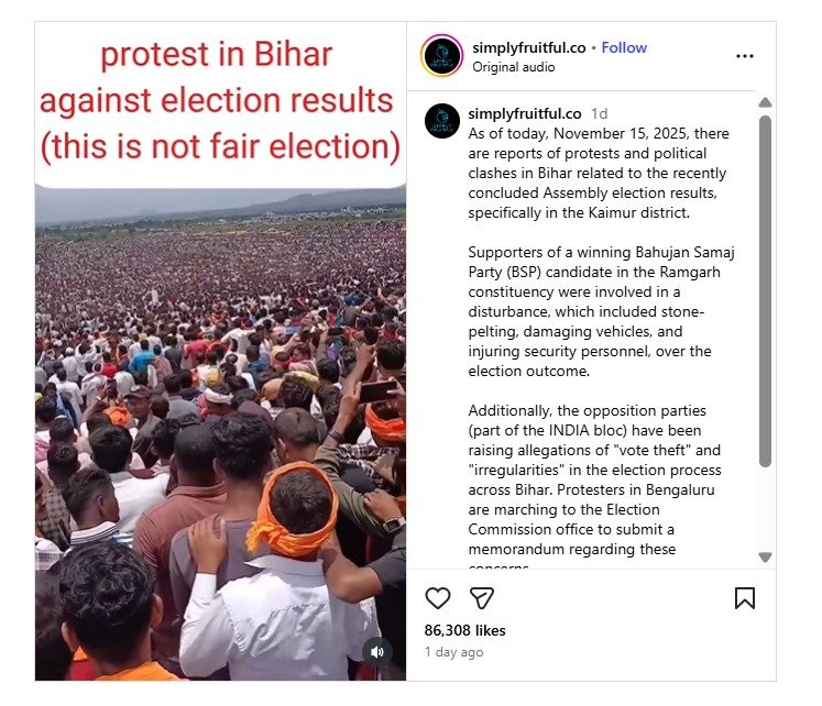 The videos do not show any protests linked to the Bihar election results. Both clips are old and originate from Assam and Maharashtra, respectively.