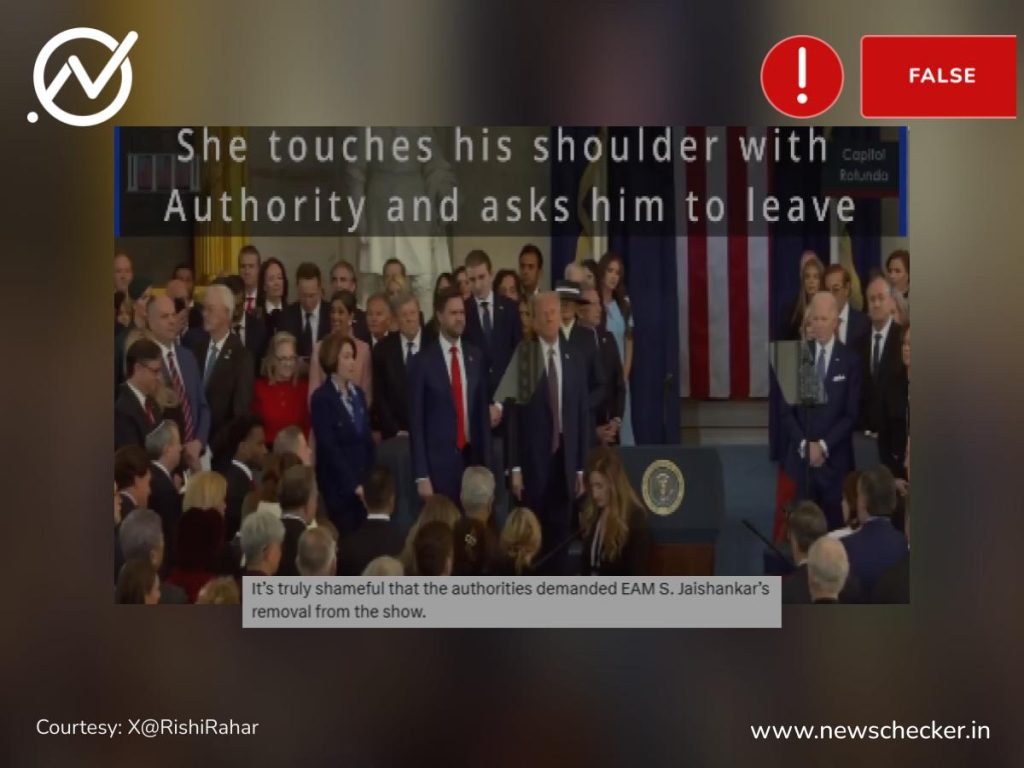 A video from the inaugural ceremony of Donald Trump as the 47th US President purportedly showing an official “demanding” Indian EAM S Jaishankar to leave the venue, went viral on social media platforms. Newschecker found the claim to be false with the video clip of an official asking a cameraperson to move away being misinterpreted.
