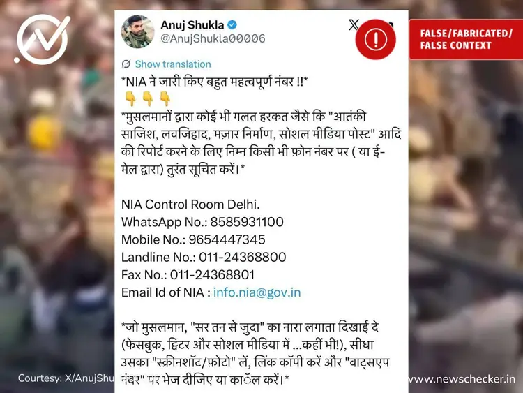 A viral message on social media claims that the NIA has issued certain phone numbers to report suspicious activities by Muslims, including those that involve “terrorist plots,” “love jihad,” “shrine construction,” or social media posts. Newschecker found the claim to be false. Read more here.