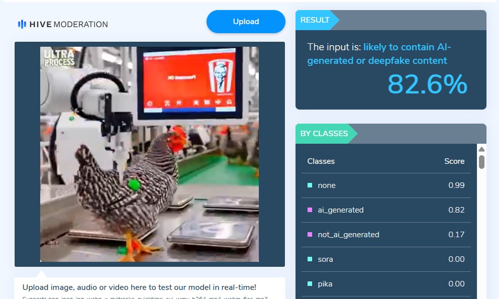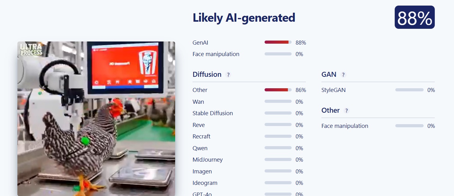 மேலும், Sight Engine Tool மூலமாகவும் இந்த வீடியோ காட்சிகள் AI மூலமாக உருவாக்கப்பட்டுள்ளது என்பது நமக்குத் தெளிவாகியது. இந்த வீடியோவே KFCயில் சிக்கன் தயாரிக்கப்படும் முறை என்று பரப்பப்படுகிறது.