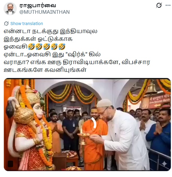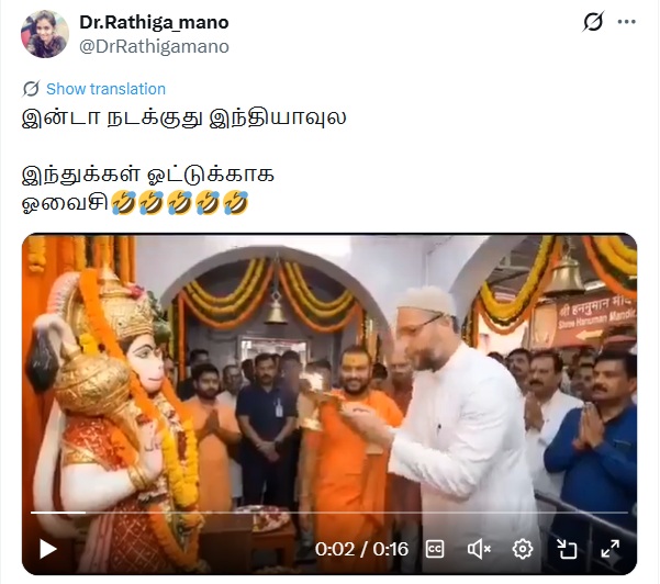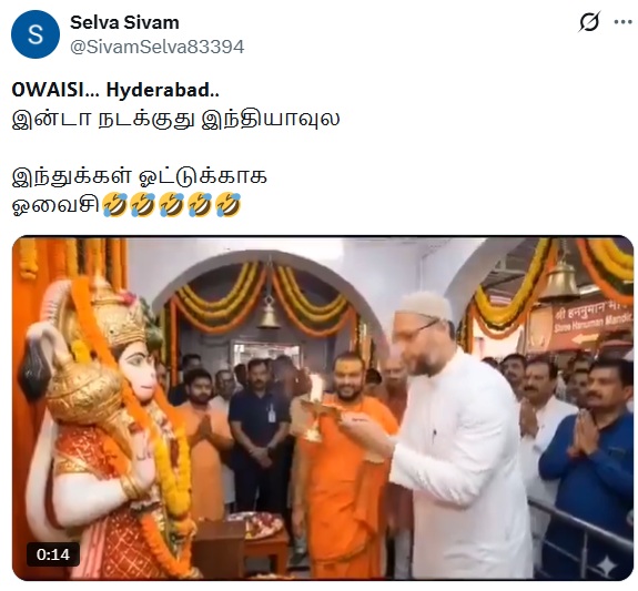 இந்துக் கடவுளான ஹனுமானுக்கு தீபாராதனை காட்டும் அசாதுதீன் ஓவைசி என்று வீடியோ ஒன்று சமூக வலைத்தளங்களில் பரவி வருகிறது.
